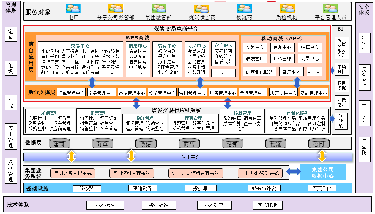 通过服务六类用户、建设“三个中心”(交易中心、信息中心、结算中心),并提供多种定制化产品和服务。对内满足电厂煤炭在线采购和集团、分子公司对燃料集中管控和供应链闭环管理要求,服务集团煤化工部和集团自有煤矿,助其开阔销售渠道,扩大煤炭销量、加快应收账款周转;对外支撑市场煤炭供应商、煤炭客户在平台上实现煤炭购销和物流供需双方的在线交易,从而实现具有市场竞争力的煤炭O2O交易平台。