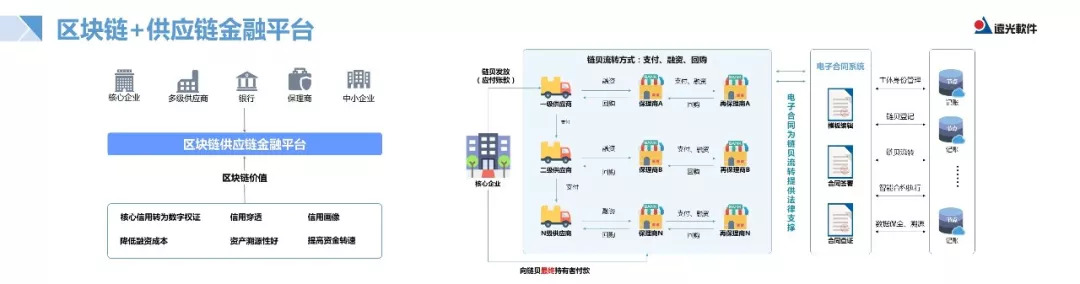 远光区块链的供应链金融平台目前发布的是1.0版本。其满足核心企业供应商的保理业务需求,也支持核心企业经销商的存货融资。该平台借助区块链技术的信任优势,改进了融资模式,以特大型、大型集团企业及金融机构为核心,以核心企业的信用为担保,将企业的应付账款(供应商的应收账款)转化成数字化的债权凭证,实现债权的线上流转。供应商与保理商之间、供应商与供应商之间、保理商与再保理商之间可灵活进行数字凭证的拆分及转让,实现供应商应收账款的线上流转与融资。通过联盟链的技术优势,核心企业,金融机构,交易关联方,多方记账,保障核心企业应付账款数据信息的真实性和有效性,从技术层面降低金融机构对外融资的风险。相比于商业票据等融资手段,其灵活可拆分,不需借助银行的票据池,降低了金融机构的准入门槛和账务风险,提高了银行及金融机构的收入,稳定了核心企业上下游的产业环境,降低了核心企业的管理成本,为广大中小企业提供了合法合规,安全可靠的融资渠道。在我国鼓励产融结合,降低中小企业融资成本的大背景下,具有非凡的意义。