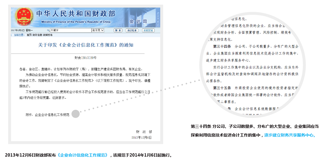作为目前企业压缩成本、改善管理流程、提高服务水平中成效较为卓著的一种管理体系,财务共享得到了国资委、财政部的认可,在政策层面积极推动央企集团加速构建财务共享服务中心。《关于加强中央企业财务信息化工作的通知》、《企业会计信息化工作规范》、《关于全面推进管理会计体系建设指导意见》等文件先后出台,鼓励大型企业和企业集团建立财务共享服务中心,加速会计职能从重核算到重管理决策的拓展。