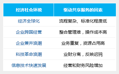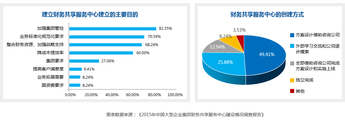 2016年,北京国家会计学院发布《管理会计转型始于财务共享服务--2015年中国大型企业集团财务共享服务中心建设情况调查报告》,指出大型集团企业已经认识到建立财务共享服务中心的意义。而其中,加强集团管控,提高业务标准化、规范化和整合财务资源加强战略支持是企业的核心诉求。在财务共享服务中心的创建方面,集团企业相信外部经验的引进能够更好、更快的推动企业财务共享服务中心的建设。