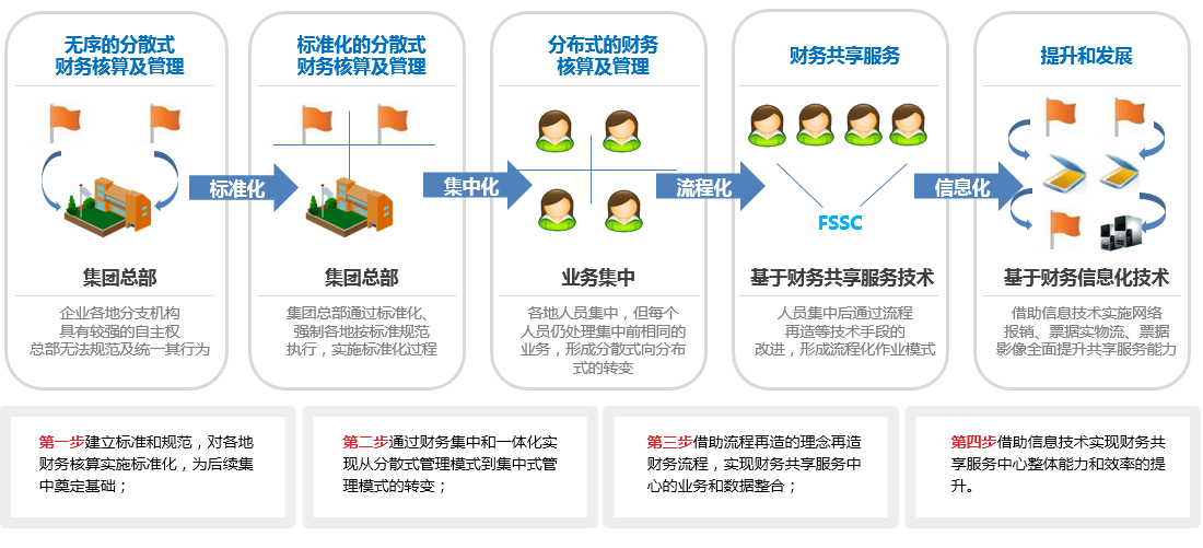 - 第一步建立标准和规范、集中核算职能、借助流程再造的理念再造财务流程,实现财务共享中心的业务和数据整合;