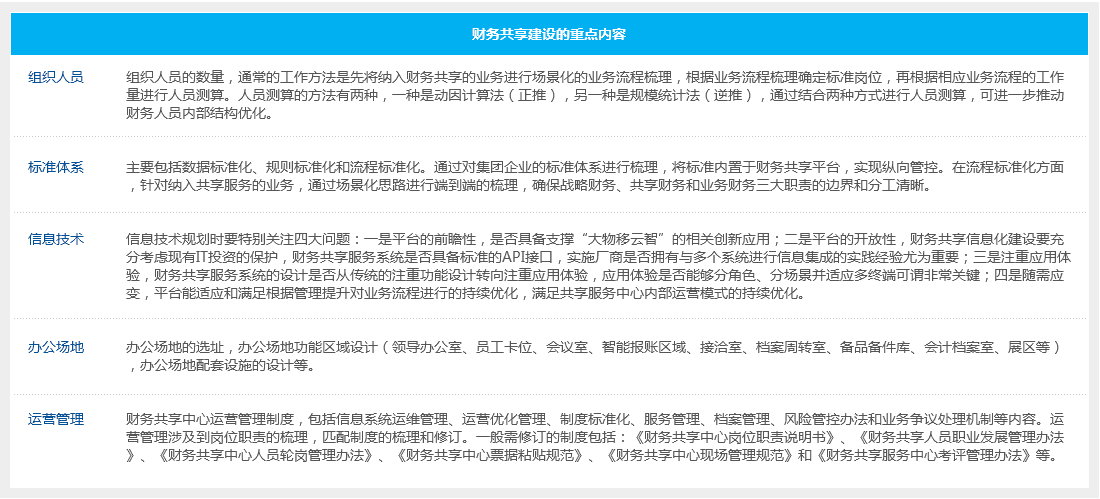 财务共享服务中心是一个五维的综合体系建设,缺一不可,建设的重点内容包括: