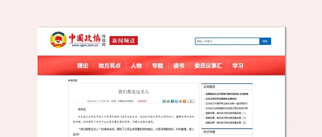 3月11日,人民政协网、中国政协传媒网先后转发公司董事长2005年为企业内刊《我们都是远光人》所作的序文,点赞陈利浩在创立之初,就将远光软件定位为“包括管理层在内的全体同事同舟共济的自治体”。