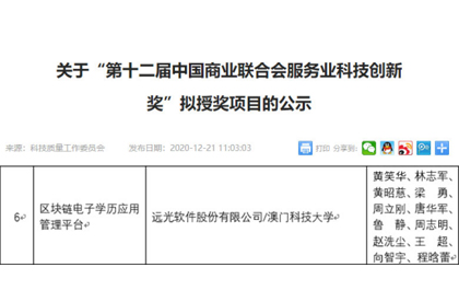 近日,由中国商业联合会组织举办的“第十二届中国商业联合会服务业科技创新奖”评审结果公示,远光软件股份有限公司与澳门科技大学联合开发的“区块链电子学历应用管理平台”荣获全国服务业科技创新三等奖。