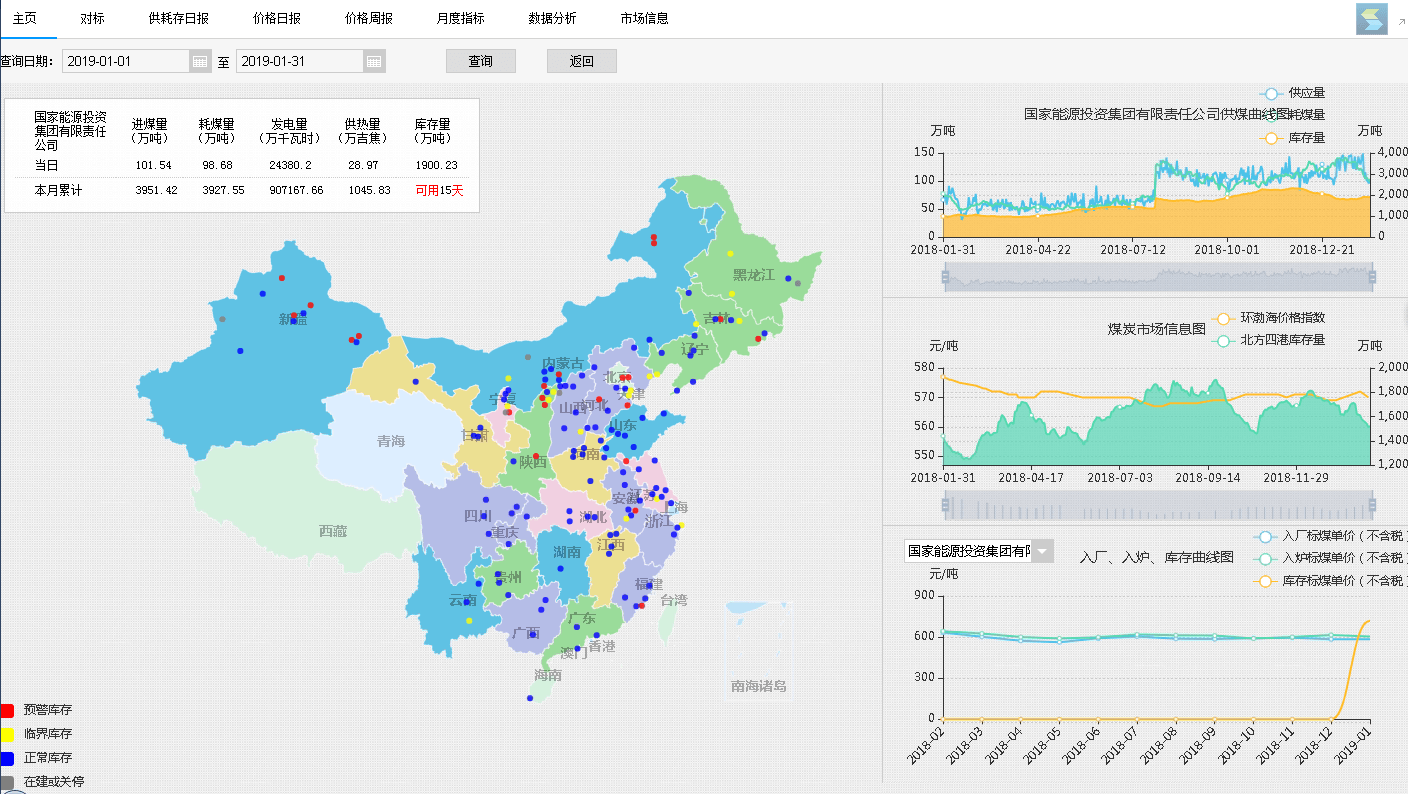 系统实时采集电厂每天存煤和入炉数据,能够实时汇总、分厂查询电厂数字化煤场情况,显示煤场情况、存煤数量、热值、价格详细数据。