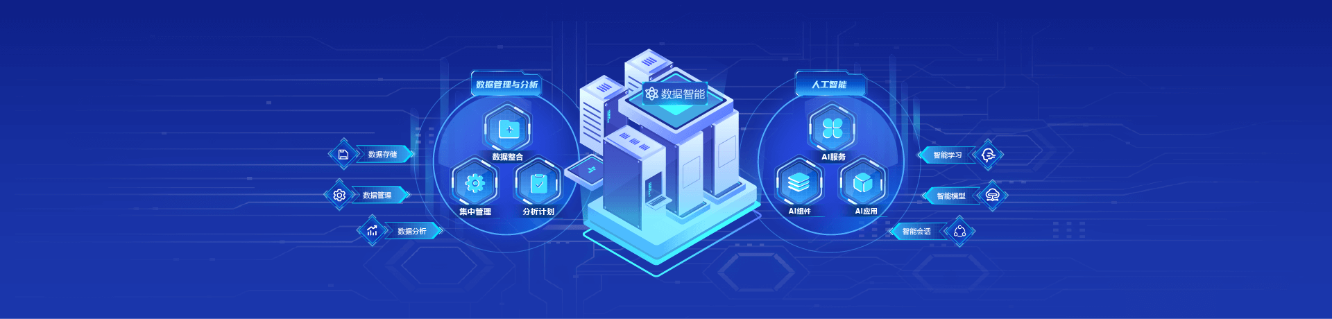 提供数据存储、数据管理、数据分析等能力,深度挖掘数据价值,由数据驱动企业决策,帮助企业降本增效。通过智能学习、智能模型、智能会话等能力,将AI深度融入业务,加快企业数字化转型。