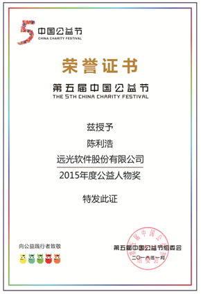 1月22日,以“因为爱 致敬公益践行者”为主题的第五届中国公益节在北京举行。远光软件董事长陈利浩因长期致力于社会公益事业,被授予2015年度中国公益人物奖。这也是其第二次受颁该项殊荣。