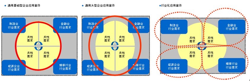 图 5表示了这三类应用软件套件与企业信息化市场的关系。其中,方块部分表示企业信息化市场,矩形表示行业化信息化市场,红色圆圈部分表示管理应用软件对企业信息化需求的覆盖情况。