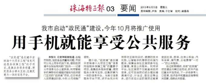 《珠海特区报》:“政民通”今年10月将推广使用 用手机享受公共服务