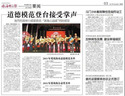 本报讯 记者纪瑾报道:昨晚,2011年度“珠海市道德模范”和“珠海公益奖”颁奖晚会在珠海电视台演播大厅举行。卓泰豪等12名同志被评为“珠海市道德模范”,广东省茂华慈善基金会等7个热心公益事业的先进团体和个人荣获“珠海公益奖”。市委常委、宣传部长、副市长陈英,市人大常委会原副主任、市慈善总会会长高存亮出席了颁奖晚会,并为获奖者颁奖。