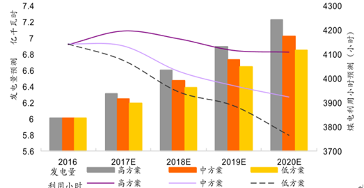 按照电力发展“十三五”规划,至 2020 年,煤电装机达到 11 亿千瓦,占比将进一步下降 3-4 个百分点。根据预测结果,按照全社会用电量 7.2、7.0、6.8 万亿千瓦时高、中、低 3 个方案考虑,2017~2020 年高方案煤电机组平均利用小时数为 4079 小时,中方案煤电机组平均利用小时数约为 3897小时,低方案煤电机组平均利用小时为 3715 小时。“十三五”期间,煤电机组装机稳步增长,同时发电小时将可能小于 4100 小时,形成煤电机组运行的“新常态”。