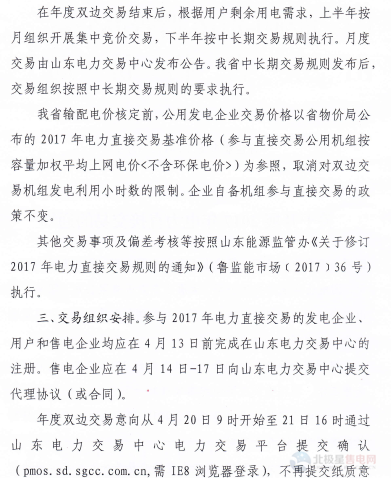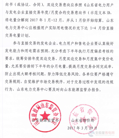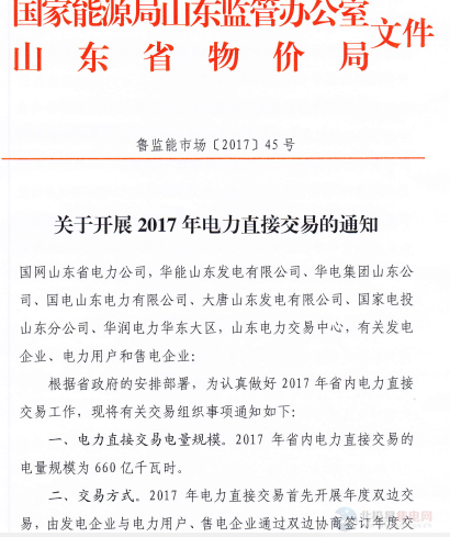 日前,国家能源局山东监管办公室、山东省物价局联合发布了《关于开展2017年电力直接交易的通知》,2017年山东省内电力直接交易的电量规模为660亿千瓦时,发电企业与电力用户、售电企业可通过双边协商签订年度交易意向书。详情如下: