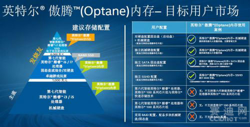 英特尔傲腾内存的作用,简单来说就是沟通系统内存与SSD或HDD之间的缓存,起到加速的作用。它需要与内存和硬盘搭配使用,并且只能安装在第七代酷睿处理器和英特尔200系列芯片组的主板或系统上。目前华硕、技嘉、微星、华擎等制造商已经推出了超过130款支持英特尔傲腾内存的主板。