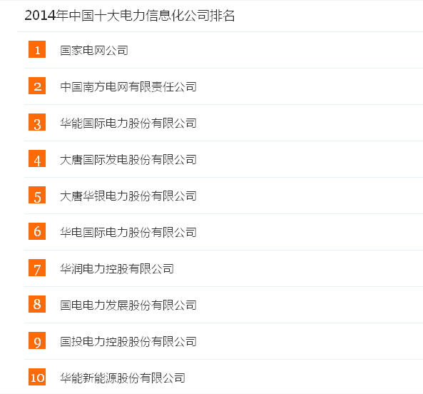 前瞻产业研究院《2014-2018年中国电力信息化产业市场前瞻与投资战略规划分析报告》统计数据显示,2014年中国电力行业十大电力信息化公司排行榜如下: