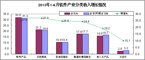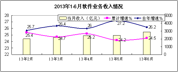 2013年上半年,我国软件和信息技术服务业总体呈稳中有落态势,各月增速始终保持在25%左右,低于去年同期0-3个百分点。软件产品收入增长加快,效益不断向好,但软件出口持续低迷,外包服务出口明显放缓。具体呈现出如下特点:
