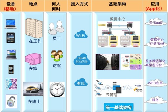移动互联网时代,企业将采用虚拟化技术协同,融合公有云和私有云,以强大的混合云方式通过SaaS(软件即服务)的方式,以互联网和企业内部网络基础架构为管道,通过智能移动终端承载企业的业务应用,直面未来需求。