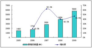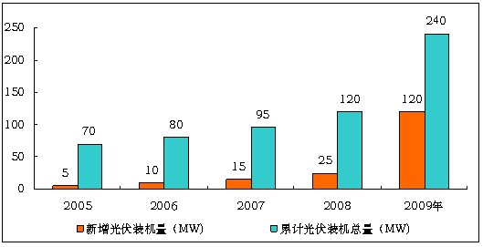 2009年在一系列补贴政策的推动下,我国光伏装机取得爆发式增长,2009年新增光伏装机量达120MW,这一数字和过去历年累计安装量相同。目前,中国光伏发电市场主要集中在通信和工业应用、农村和边远地区应用、光伏并网发电系统和太阳能商品等领域。