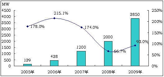 2009年,中国太阳能电池产量达到3850MW,继续保持了超过世界太阳能电池生产平均增长率的速度,增长率达93%。