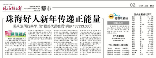 珠海好人新年传递正能量 陈利浩再行善举,为“最美代课教师”捐款133333.33元