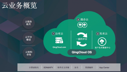 刘靓用一张图展示了青云QingCloud的业务概览,包括公有云、私有云以及混合云。