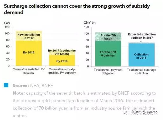 根据行业资源,2016年,中国可再生能源基金仅收到700亿元附加费,这并不足以覆盖所有项目的资金补贴需求。据彭博新能源财经估算,在不考虑消纳的情况下,如果包括第七批可再生能源补贴目录,中国可再生能源基金年度支付需求超过1000亿人民币。