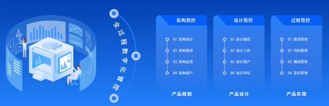 通过企业架构管控、设计开发管控、用户体验管控、研发过程管控等能力,帮助企业实现从战略规划到可研立项、从业务需求到应用设计,从系统开发到交付运维的全栈技术管控,增强企业数字化管控力度,提升数字化建设质量。