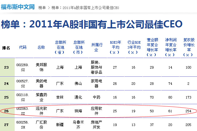 这是福布斯中文版第七次针对A股各非国有上市公司CEO进行调查后发布的榜单。福布斯透露,考察CEO的指标主要包括:一是在企业连任三年;二是调研的年限为三年以内,时间截至为2010年12月31日的1041家非国有上市公司;三是重点考察CEO所管理公司的基本面和市场表现。特别考察不同时间段,CEO能否在面临宏观环境与微观层面时应对挑战,带领公司稳健经营,从而体现CEO的价值。而翻阅远光2008-2010年的年度报表,据福布斯统计,远光软件的主营收入与净利润年复合率分别为50%和61%。对于公众公司的投资者,远光软件取得的成绩是亮丽且完美。