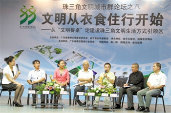 餐桌上的行为可以体现用餐者的文明习惯。昨日,由省精神文明委员会和南方报业传媒集团联手举办的珠三角文明城市群论坛第八站走进美丽的海滨城市珠海。在充满书香气息的珠海市图书馆报告厅,6位专家、学者与社会组织负责人作为论坛嘉宾,围绕“文明从衣食住行开始―――从"文明餐桌"论建设珠三角文明生活方式引领区”这一主题与市民热烈互动,共享了一场思想盛宴。多位嘉宾指出,请客吃饭切忌点菜过多,号召市民从个人做起共建“文明餐桌”。昨日的论坛还发布了《“文明餐桌”倡议书》,号召大家从我做起,从小事做起,与文明握手,向陋习告别,为共建珠三角文明生活引领区和幸福广东给力加油。