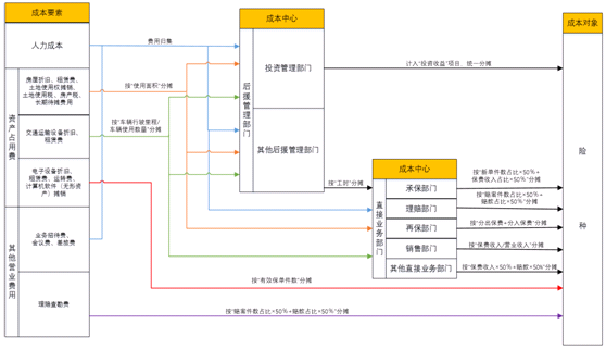 1. 建立成本中心。成本中心包括部门和分支机构,其中部门包括直接业务部门,如承保部门、理赔部门、再保部门、其他直接业务部门,和后援管理部门,如投资管理部门和其他后援管理部门。各保险公司可根据各自的组织结构进行差异化设置。