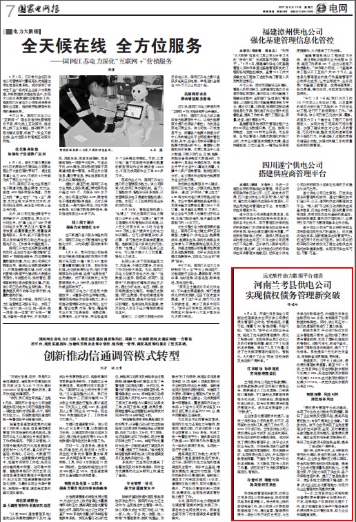 9月6日,河南兰考县供电公司副总经理郭俊杰在评价该公司债权债务管理平台时说:“标准规范,存量可控,增量可知,智能预警,风险可控。”她认为,“该平台从实际业务出发,规范了往来款项清理操作,简化了账龄分析,实现报表出具自动化以及收付款智能预警,避免了手工处理的诸多弊端,降低了人员工作量,促进了往来款项管理的规范化、智能化,大大提升了企业‘两金’压控指数及流动资产周转率。”