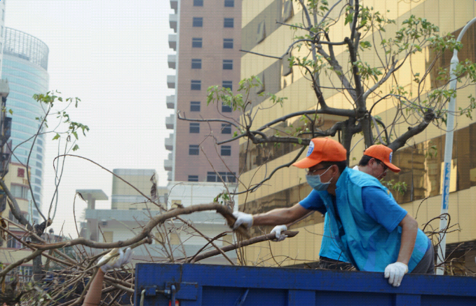 ▲ 高级副总裁毛华夏在运输车上将枯枝、垃圾整理装车