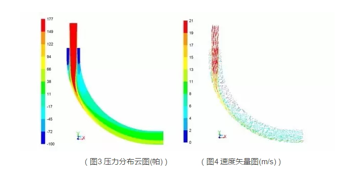(2)根据速度矢量图,可以根据垂直速度方向的横截面的平均速度来得出通过弯管后的速度变化,再根据工程应用中对平均传输速度的要求,对风机的转速进行调整。