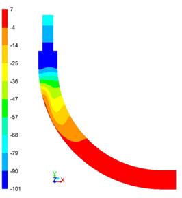 这是由于气体在通过弯管时,受到离心力的作用,在弯管弧形处形成二次涡旋流,导致气体的流场产生了紊流的变化,气流分子发生相互碰撞,最终导致管道中的压强和速度的急剧变化。而这个离心力也是导致压强损失的主要原因。根据管道的静压图如图5,由出口处的静压与入口处的静压差可以得到此弯管在风量为320m3/h时的情况下压降为108Pa。