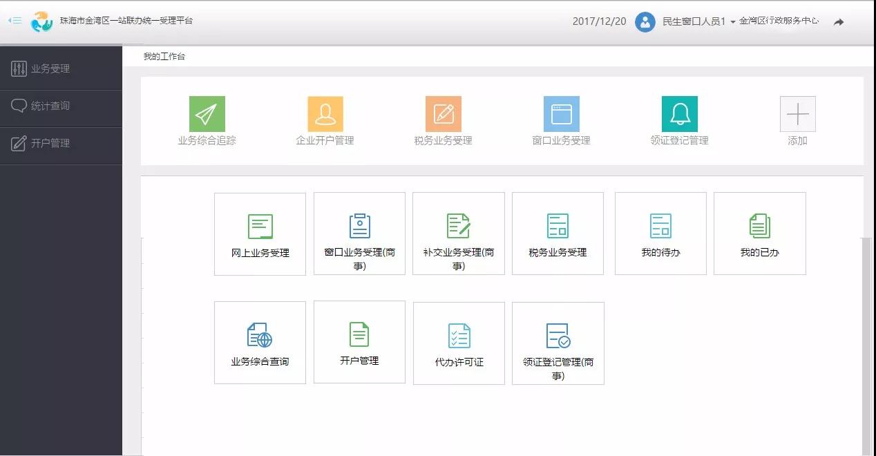 目前,金湾区行政服务中心已围绕“一站联办”系统,正式启用企业登记和社会组织登记两大业务,为各行业企业和社会组织提供便捷的办事渠道和优质的平台服务。