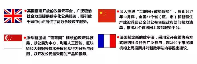 在数字经济时代,政府构建完善社会治理体系的一大特征,就是以更好服务和管理公众为导向,以效率提升、功能完善为主旨,大量采用以互联网、大数据、人工智能为代表的新一代信息技术,感知社会态势、畅通信息渠道、辅助科学决策,提升治理能力的现代化水平。网络化的架构和理念已在政府事务领域得到深度融合应用,未来将在进一步优化事务流程的同时,重点提升政务服务的便捷性和政府的综合服务能力。构建统一、共享的开放数据平台已成全球趋势,将实现跨层级、跨区域、跨行业的协同管理和服务,为精准化、高效化的社会治理提供决策支持。各类网络化、智能化信息平台加速构建,鼓励和引导社会公众积极参与治理过程,逐步形成共策共商共治的良好生态。