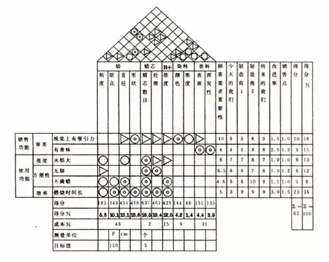 HOQ 用于界定顾客需求和产品功能之间的关系。此工具用于质量功能配置,促进团队决策。 HOQ的构造始于分析顾客需求,写在矩阵的行里。矩阵列中是产品或服务的重量特性。矩阵中心和边缘是这组信息的关键,指导新设计的决定。