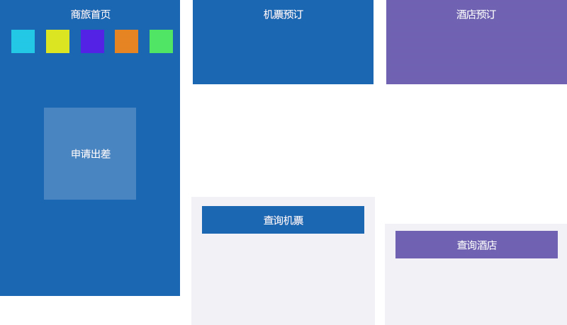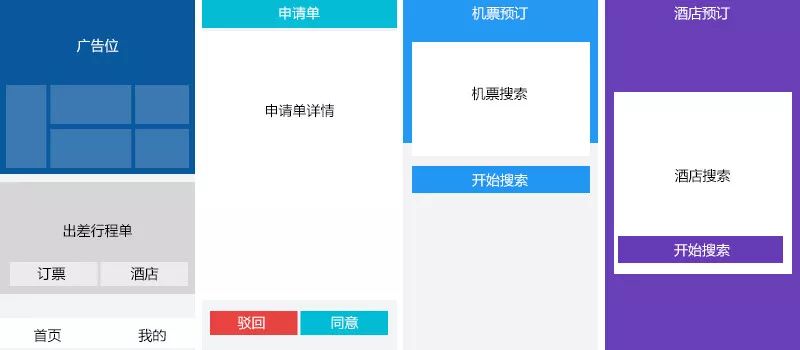 (改版前)从左到右依次是首页、申请单、机票预订、酒店预订