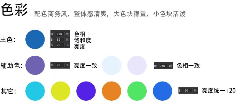 在色相,饱和度,亮度(HSB)上做简单的关联性。可以看到商旅的色彩方案中,以主色蓝色的HSB为基准,辅助色保留了亮度(B)一致,调出预订酒店的主色,在蓝色和紫色两个颜色的基础上,保持色相(H)一致,又调出了相应的浅色系。其它色彩应用面积小,我们在主色的亮度(B)数值上做了加减法,统一+20并保持一致。掌握这样的技巧,小编可以说每做一个设计都像是完成了一幅毕加索的作品一样。