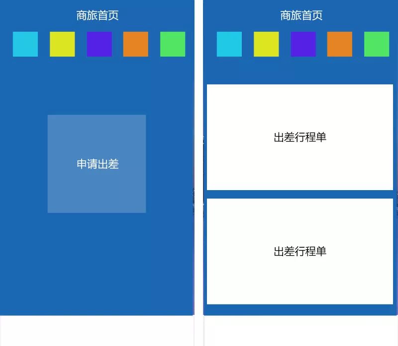 当有了行程和订单时,用户的使用关注点改变,以卡片式设计的申请单出现,代替了原有位置的“+”申请出差图标,“+”常驻在页面底部菜单栏,随时可以使用。