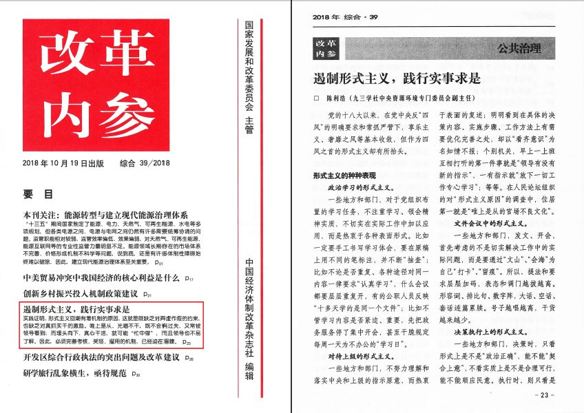 2018年10月19日,由国家发展和改革委员会主管、中国经济体制改革杂志社编辑的《改革内参》,刊发九三学社中央环境资源专门委员会副主任、广东省新的社会阶层人士联合会监事长、广东省政协研究咨询委员会委员、远光软件股份有限公司董事长陈利浩的署名文章《遏制形式主义,践行实事求是》。