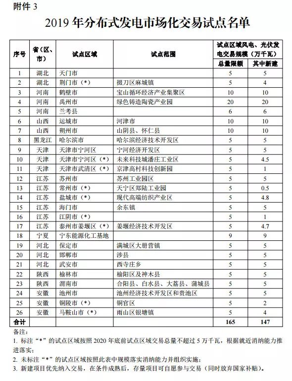 日前,国家发改委、能源局日前联合发布了《关于公布2019年第一批风电、光伏发电平价上网项目的通知》,并公布了2019年分布式发电市场化交易试点名单,26个试试点区域集中在湖北、河南、山西、黑龙江、天津、江苏、宁夏、河北、陕西和安徽等10省份,总量限额为165万千瓦。
