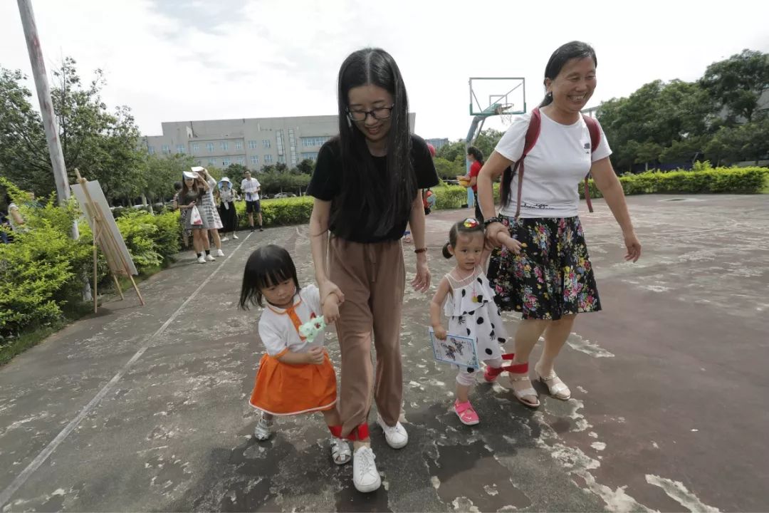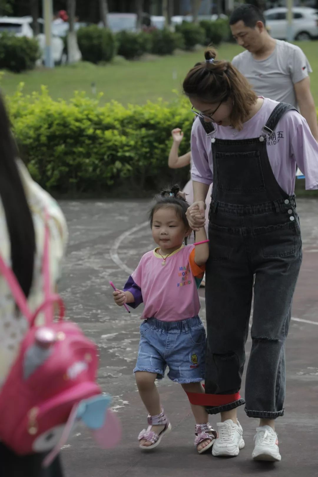 “两人三足”宝贝与大人默契配合,调整步伐,携手同行,顺利到达对岸