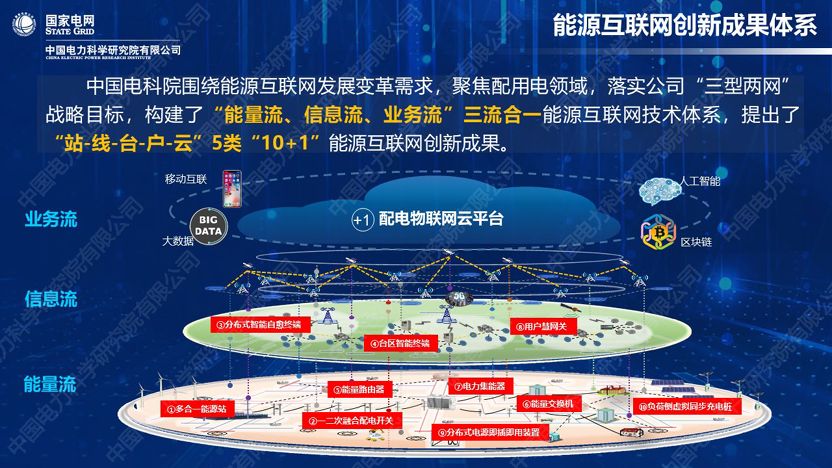 会议期间,中国电科院围绕能源互联网发展变革需求,聚焦配用电领域,落实公司“三型两网”战略目标,构建了“能量流、信息流、业务流”三流合一能源互联网技术体系,提出了“站-线-台-户-云”5类“10+1”能源互联网创新成果。