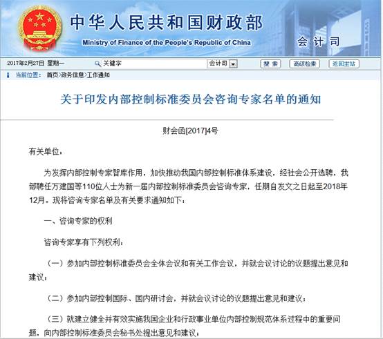 2016年9月2日,为充分发挥内部控制专家智库作用,加快推动我国内部控制标准体系建设,财政部发出《关于公开选聘内部控制标准委员会咨询专家的通知》,经社会公开选聘,聘任了万建国、李啸虎等110位专业人士为新一届内部控制标准委员会咨询专家,任期自2017年2月8日起至2018年12月。