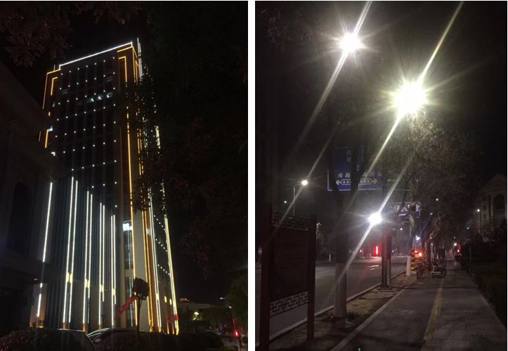 夜晚国能集团甘肃公司客户办公大楼与下班后的街道